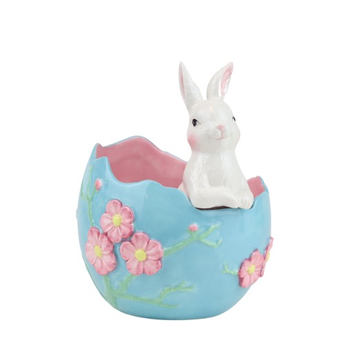 Dit is een kom in de vorm van een konijnenei. Deze kom heeft de vorm van een ei, met decoratieve elementen en een konijn middenin. Het is schattig en speels.