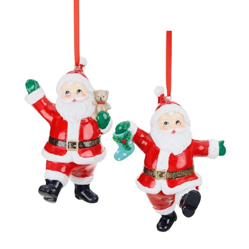 Deze gedetailleerde ornamenten tonen een vrolijke kerstman met een gevulde kerstsok, waarin een schattige teddybeer nieuwsgierig tevoorschijn komt.
